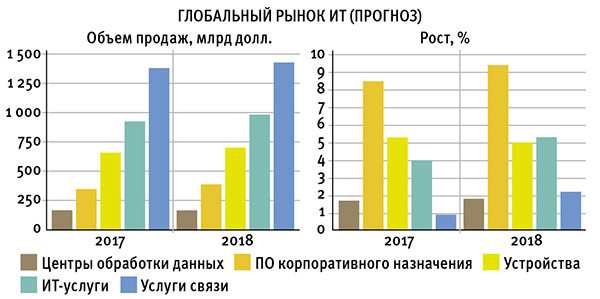 Закупки ИТ-товаров и услуг в 2018 году в мире вырастут по сравнению с 2017 годом на 4,3%, полагают аналитики. Сегменты корпоративного программного обеспечения и ИТ-услуг по-прежнему быстро растут, но самым крупным все еще остается сегмент услуг связи. Еще квартал назад прогнозы Gartner были заметно скромнее — 3,5% роста. Продажи оконечного оборудования не росли уже два года, но в 2017 году увеличатся на 5,3%, а в 2018 -м — еще на 5%. Основными факторами роста аналитики считают повышение средней цены на смартфоны верхнего класса на развитых рынках (в частности, благодаря выпуску iPhone 8 и 10), а также спроса на ПК со стороны организаций, начавших переход на Windows 10. Аналитики Gartner выделили десять наиболее перспективных сегментов рынка ИТ. Все они, и в том числе три облачных сегмента — IaaS (инфраструктура как сервис), iPaas (интегрированная платформа как сервис) и cPaaS (коммуникационная платформа как сервис), связаны с цифровой трансформацией бизнеса.