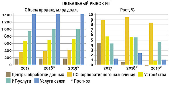 Мировые продажи продуктов и услуг ИТ в 2018 году вырастут на 4,5% по сравнению с 2017 годом и достигнут 3,7 трлн долл., полагают аналитики Gartner. Рост будет продолжаться по крайней мере в течение нескольких лет, хотя неуверенности добавляют потенциальные последствия выхода Великобритании из ЕС, колебания валютных курсов и возможность глобальной рецессии. Основными двигателями роста будут проекты в областях цифрового бизнеса, блокчейна, Интернета вещей и переход от обработки больших объемов данных к алгоритмам, машинному обучению и искусственному интеллекту. Сегмент корпоративного ПО вырастет в 2018 году на 9,5%, а в 2019-м — еще на 8,4%. При этом все большая доля продаж будет приходиться на SaaS-сервисы. Сегмент оборудования в 2018 году вырастет на 5,6%.