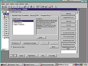 В состав BorderManager входят сетевой фильтр, три шлюза сеансового уровня и не менее восьми посредников прикладного уровня. Практически все они привязаны к службе каталогов Novell NDS и управляются через NetWare Administrator.