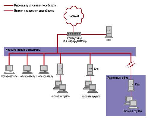 ![]() Распределение серверов кэширования по предприятию - например по одному серверу в каждом удаленном офисе или в крупной подсети - позволяет сократить трафик Internet через глобальную сеть или по сетевой магистрали. |
