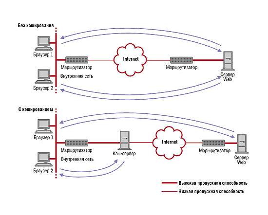 Технология кэширования реализуется обычно по двум основным причинам - в целях более эффективного использования пропускной способности и для ускорения работы приложений на базе браузеров. Если доступ в Internet тяжелым бременем ложится на сеть вашей организации, то серверы кэширования предоставляют экономичный способ высвобождения пропускной способности без приобретения более дорогого соединения Internet. Серверы кэширования, кроме того, помогают ускорить работу браузеров, приобретающих все большее значение с переводом важных для бизнеса приложений в сети Intranet на базе IP.