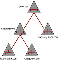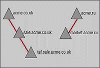 Служба каталогов Active Directory (AD) должна появиться в операционной системе Windows 2000. Ради сохранения совместимости с доменами NT компания Microsoft была вынуждена в качестве основной функциональной единицы службы каталогов оставить домен, привязав его к доменной службе Internet (DNS) (см. Рисунок 2). Иными словами, каждый домен Active Directory является теперь доменом DNS. Внутри домена AD поддерживается иерархическое пространство имен, где контейнерами выступают объекты типа "подразделение" (Organizational Unit, OU). Домены образуют еще одну иерархическую структуру, называемую деревом (см. Рисунок 3). Между доменами установлены доверительные отношения, которые в отличие от Windows NT 4.0 являются транзитивными.