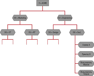 Для организации ресурсов корпоративных и распределенных сетей лучше всего подходит служба каталогов. Служба каталогов представляет собой распределенную тиражируемую базу данных, где хранится логическое описание сетевых ресурсов. Сетевые ресурсы организуются в иерархическую структуру, называемую деревом (в сети может быть несколько деревьев). Пользователи, группы пользователей, принтеры, компьютеры и другие представляют собой конечные объекты (листья) дерева. Они содержатся внутри контейнеров, в качестве которых могут выступать объекты "организация", "подразделение" и т. д. (см. Рисунок 1). В современных службах каталогов количество вложений контейнеров не ограничено. С каждым объектом связаны его атрибуты (в NDS они называются свойствами), где хранится информация об объекте. Например, для объекта "пользователь" атрибутами являются фамилия, телефон, адрес электронной почты, список контроля доступа и т. п.