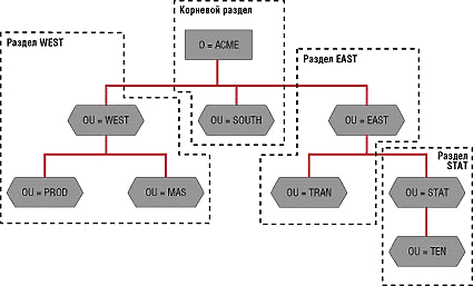 Дерево NDS разбивается на один или несколько разделов (partition). Их назначение состоит в делении общей базы NDS на части в целях упрощения тиражирования. Таким образом, сервер NDS хранит лишь часть общей базы NDS (в пределах раздела). Раздел может представлять собой один или несколько связанных между собой контейнеров (см. Рисунок 6). Сервер NDS может выступать в качестве хранилища основной реплики (основной копии) раздела, реплики для чтения и записи, реплики только для чтения и реплики подчиненной ссылки. Особенностью реплик NDS является то, что сервер может одновременно служить для хранения реплик разных разделов NDS. При этом сервер NDS может хранить реплики любых разделов независимо от того, в каком контейнере NDS расположен сам сервер. Тиражирование разделов NDS основано на использовании временных меток, т. е. каждому событию присваивается отметка о времени. Это позволяет разрешать конфликты при обработке запросов к базе данных NDS.