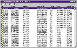 Аудит не менее важен, чем меры по предотвращению несанкционированного доступа. По умолчанию в журнал безопасности (security log), просмотреть который можно с помощью Event Viewer, ничего не записывается. Однако после включения аудита из программы User Manager в журнале будут регистрироваться все не оговоренные попытки доступа (см. Рисунок 1).