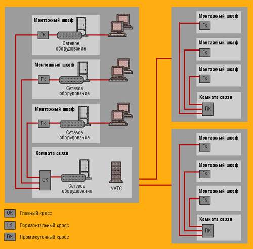 Кроссы бывают нескольких типов. Главный кросс обеспечивает соединение между аппаратной и горизонтальными кроссами, возможно, через промежуточный кросс. Горизонтальный кросс связывает горизонтальную проводку с другими типами проводки, в частности с магистралью и оборудованием. Промежуточный кросс представляет собой точку терминирования и администрирования магистральной проводки между главным и горизонтальными кроссами. На Рисунке 1 показано, как все эти разновидности кроссов, вместе с другими компонентами, вписываются в общую инфраструктуру сети.
