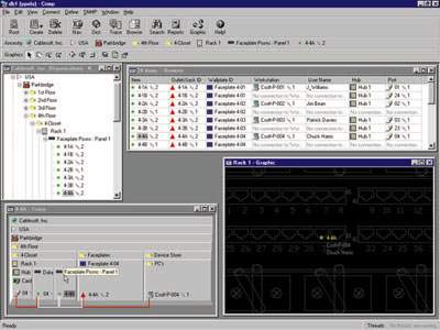 Примером программного пакета для управления кабельной системой может служить Crimp Enterprise Server 5.0 от Cablesoft (http://www.crimp.com). Crimp — это многопользовательский пакет корпоративного уровня с поддержкой иерархических видов сетевой инфраструктуры (см. Рисунок 2). Программное обеспечение предлагается на выбор как с поддержкой графики и библиотечных модулей, так и без оной. Обращаться к центральной базе и обновлять ее могут одновременно несколько пользователей.