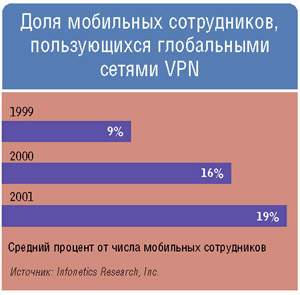 | Глобальные VPN. Данные Infonetics Research свидетельствуют о тенденции к глобализации во многих сегментах рынка передачи данных. В ближайшие несколько лет доля мобильных сотрудников, пользующихся глобальными сетями VPN, должна удвоиться. |