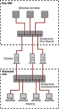 | Рисунок 5. Типовая схема объединения локальной сети и сети SAN. |