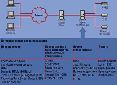 | В середине. Программное обеспечение сервера приложений может находиться на том же компьютере, что и сервер Web, или, как на Рисунке, располагаться между сервером Web и внутренними бизнес-процессами. Оно предоставляет интегрированную среду разработки с функциями представления, бизнес-логики, доступа к базам данных и защиты. |