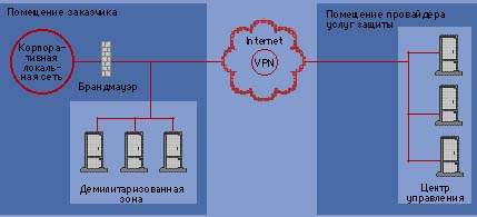 Поставщики по-разному подходят к обеспечению защиты, но наиболее распространенным способом является установка провайдером своего оборудования в вашем офисе и подключение к нему по защищенному соединению (см. Рисунок). Мейерс говорит, что большинство предложений ePatrol компании ISS ориентируются на защиту по периметру. ISS приобретает и конфигурирует аппаратно-программное решение, а затем устанавливает его на узле заказчика. После установки ISS управляет им удаленным образом через Internet по соединению VPN для обеспечения конфиденциальности и целостности информации между узлом заказчика и ISS.