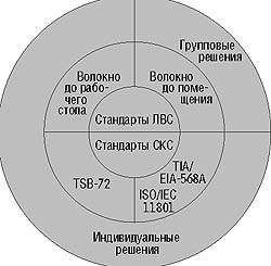 Правила и принципы построения СКС как технического объекта скрупулезно описаны в целом ряде широко известных действующих и перспективных американских и международных стандартов. Несмотря на то что она нередко насчитывает в своем составе десятки тысяч отдельных элементов, СКС имеет четко установленные состав компонентов, интерфейсы и структуру, в число которых активное оборудование не входит. Различные производители СКС и оборудования для их создания по-разному подходят к проблеме введения в состав своей системы как рыночного продукта активных сетевых устройств, нестандартных с точки зрения действующих в этой области общепризнанных нормативных документов. Значительная часть таких производителей строго следует «букве закона» и вообще не упоминает конкретные активные сетевые устройства в своих каталогах. Другие, основываясь на перечисленных выше преимуществах, в большем или меньшем объеме вводят в состав своих СКС самые разнообразные активные устройства. В число этих производителей входят такие гранды рынка СКС, как Lucent Technologies (система радиосвязи WaveLAN), Ortronics (система волоконно-оптических преобразователей среды TransOptix), Alcatel (волоконно-оптические устройства нижнего уровня) и некоторые другие.