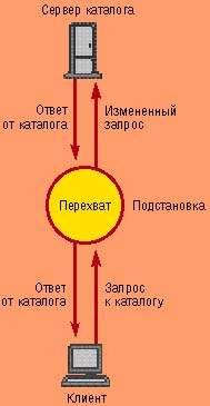 | Рисунок 1. Атака с подстановкой позволяет злоумышленнику перехватить информацию во время сеанса связи между клиентом и каталогом. |