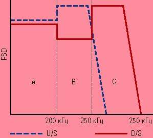 В диапазоне частот А (примерно до 200 кГц), где переходное влияние минимально, спектральные плотности (Power Signal Density, PSD) нисходящего (DownStream, D/S) и восходящего (UpStream, U/S) сигналов одинаковы. В диапазоне частот В (полоса частот 200—250 кГц) спектральная плотность нисходящего сигнала меньше спектральной плотности этого сигнала в диапазоне А в целях уменьшения переходного влияния NEXT на восходящий сигнал в этой области частот. Благодаря этому, переходные влияния NEXT в диапазонах частот А и В оказываются одинаковыми. В свою очередь, спектральная плотность сигнала восходящего потока в диапазоне частот В уменьшена по сравнению с аналогичным параметром этого сигнала в диапазоне А. Это позволило дополнительно улучшить отношение сигнал/шум в области частот В. Следует отметить, что уменьшение спектральной плотности восходящего сигнала в диапазоне В практически не ухудшает отношения сигнал/шум нисходящего сигнала на входе пользовательского модема по двум причинам: во-первых, полоса частот нисходящего сигнала расширена по сравнению с полосой частот восходящего сигнала, в результате чего первый оказывается менее чувствительным к переходному влиянию со стороны второго. Во-вторых, модемы пользователей пространственно разнесены, что также уменьшает уровень переходной помехи. В диапазоне частот С спектральная плотность нисходящего сигнала максимальна, поскольку восходящий сигнал в этой области практически равен нулю. Поэтому отношение сигнал/шум для нисходящего сигнала на входе модема пользователя оказывается высоким.