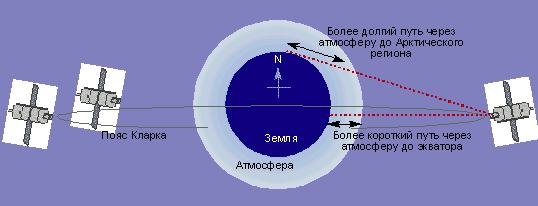 | Чем ближе к Северному или Южному полюсу находится пользователь, тем больший слой атмосферы вынужден преодолевать луч от геостационарного спутника. Это ослабляет сигнал, поэтому пользователю необходима параболическая антенна большего диаметра. |