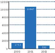 | Рисунок 2. Поквартальная развернутая диаграмма результатов анализа спама CAUBE.AU. Результаты после марта 2002 г. пока еще не опубликованы. CAUBE.AU планирует публиковать данные и в будущем. |