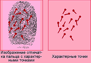 | Точечные факты. «Характерные точки» однозначным образом определяют отпечаток пальца. Они отмечают те места, где заканчиваются завитки и выпуклости в рисунке сосудов, и являются уникальными для каждого конкретного пальца. Таким образом, отпечаток может быть идентифицирован с помощью характерных точек, хотя воссоздать его по этим точкам невозможно. |
