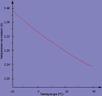 | Рисунок 2. График зависимости напряжения подзаряда элемента батареи от температуры. |