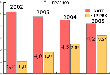 | Рисунок 1. Соотношение продаж традиционных УАТС и IP PBX в США в млн линий (по данным TEQConsult Group) |