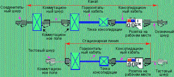 Вместо горизонтальной подсистемы стандарта 1995 г., где была описана 90-метровая стационарная линия (Link) и 5 м коммутационного шнура (patch cord), новый нормативный документ специфицирует стационарную линию (Permanent Link) без шнура.