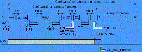 PCF управляет передачей данных в бесконфликтном диапазоне (бесконфликтный период), DCF регулирует доступ к среде в конкурентном временном интервале (конфликтный период).