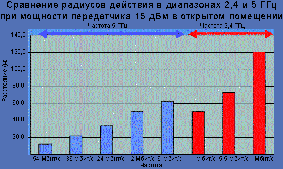 Сравнение радиусов действия в диапазонах 2,4 и 5 ГГц.
