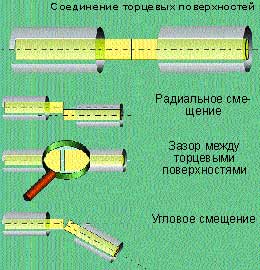Все конструкции оптических разъемов нацелены прежде всего на достижение идеального контакта торцевых поверхностей соединяемых волокон. Для минимизации потерь необходимо обеспечить минимальное значение радиального и углового смещения, а также зазора между сращиваемыми световодами (см. Рисунок 3).