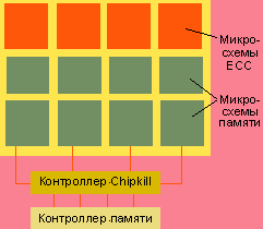 | Рисунок 2. Контроллер Chipkill объединяет память в банки по четыре модуля и распределяет каждое слово по всем модулям банка. Выход одной микросхемы из строя ведет к потере одного разряда в каждом слове банка. Данные восстанавливаются с помощью контрольной суммы и алгоритма ECC. Chipkill позволяет применять стандартные модули ECC и поддерживается в наборах микросхем ServerWorks и Intel. |