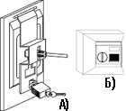| Рисунок 3. Технические средства для защиты от несанкционированного доступа к розеточным модулям ИР: а) поворотная скоба с навесным замком; б) запирающаяся на замок защитная шторка. |