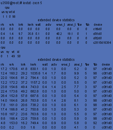 Если последние три показателя близки к нулю, то это означает, что серверные диски достаточно быстрые, а ввод/вывод оптимально распределен между контроллерами и не создает «узких» мест, т. е. «все в норме». На практике для диска, находящегося под нагрузкой, значения показателя asvc_t будут не нулевые, поскольку любому диску требуется некоторое время на исполнение запросов ввода/вывода.