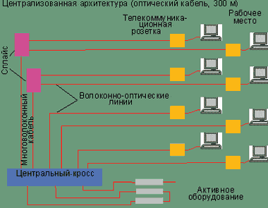 | Рисунок 2. По сравнению с медными, полностью оптические СКС допускают значительно большую централизацию архитектуры. Централизованная архитектура с многомодовым волоконно-оптическим кабелем, определяемая стандартами TIA/EIA-568-B.1, ISO/IEC 11801 и EN50173, позволяет упростить и удешевить решение. Всю электронику можно размещать в одном центральном помещении, получив экономию площадей и шкафов. |