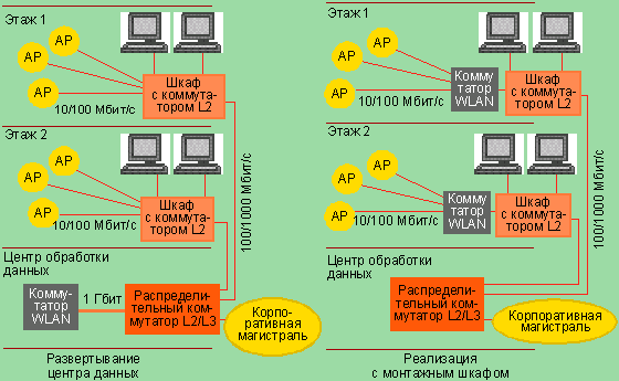 Коммутаторы WLAN от Aruba могут быть установлены централизованно в вычислительных центрах (слева) или децентрализованно в монтажных шкафах на каждом этаже (справа).