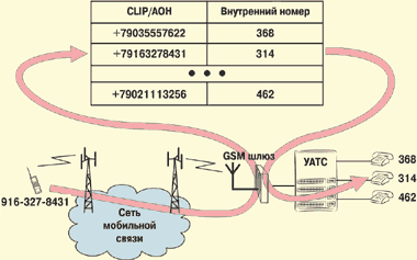 - клиенты могут воспользоваться тональным донабором или быстрым автоматическим соединением с внутренними абонентами УАТС (применение CLIP/АОН в мосте GSM для автоматического выбора номера абонента УАТС по таблице соответствий между номером вызывающего мобильного и номером вызываемого на УАТС).