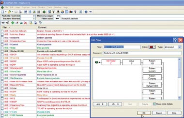 Для более детальной проверки соблюдения правил безопасности в беспроводных сетях («аудита безопасности»), как правило, этих ограниченных «функций экспертного анализа» не хватает. Необходимы дополнительные возможности распознавания. В протокольных анализаторах они реализуются посредством индивидуально определяемых фильтров протоколов. Таким образом удается распознавать стандартные ESSID производителей точек доступа или попытки подключения пользователей посредством указания универсального сетевого имени ANY. Соответствующие фильтры способны вылавливать и актуальные атаки DoS, например SQL Slammer, или «червей», таких, как MSblaster.