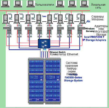 Отдельные серверы под управлением Windows взаимодействуют с системой хранения данных посредством коммутаторов Ethernet.
