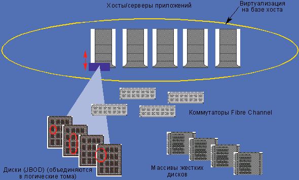 В случае виртуализации на базе хоста логический менеджер томов функционирует в качестве интерфейса, объединяющего в логические тома различные физические ресурсы хранения: отдельные жесткие диски или логические устройства.