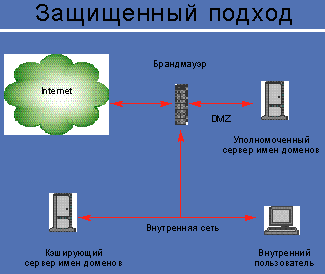 | Рисунок 2. Разделение общедоступного и кэширующего сервера имен доменов значительно снижают опасность нападения. |