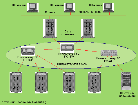 Пример сети хранения с коммутаторами и концентратором Fibre Channel. Чем меньше коммутаторов, тем больше эффективность, т. е. умеренное время прохождения и умеренное число непродуктивных горизонтальных и вертикальных поперечных соединений.