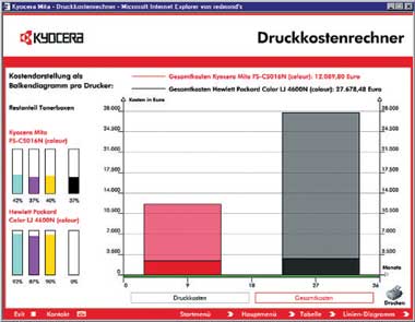 Kyocera Mita, производитель принтеров, очень щепетильно подходит к вопросу стоимости обслуживания и экологии: в своей технологии Ecosys компания сделала ставку на долговечность барабанов, девелопера и термофиксаторов и отказалась от обычных лазерных картриджей. То, что это действительно имеет смысл, демонстрируется с помощью «счетчика стоимости принтера», найти который можно на странице Web компании (см. Рисунок 2). С помощью этого калькулятора можно сравнить конкретные модели принтеров известных производителей — смелое начинание, которому конкуренты пока ничего противопоставить не могут.