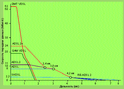 Скорости передачи данных по технологии xDSL и расстояния (для пары с сечением 0,4 мм).