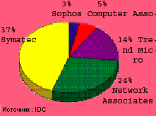 Среди пяти важнейших производителей антивирусных программ (см. Рисунок 1) первое место, согласно упомянутому исследованию IDC, надежно занимает Symantec. Ее доля на рынке составляет 37% (2002 г.). Впрочем, высокий рост продаж только условно отражает предпочтение пользователей: при подсчете учитывались также лицензии, которые приобретались вместе с новым компьютером. С долей рынка в 24% также очень хорошо смотрится в этой гонке Network Associates, в то время как Trend Micro с 14% остается несколько позади. Computer Associates и Sophos, имеющие 5 и 3% рынка соответственно, пока находятся лишь в первой десятке. К другим значительным игрокам — в частности на европейском рынке — относятся Central Command, F-Secure, H+Bedv, Kaspersky Labs, Norman Data Defense, Panda и Sybari.