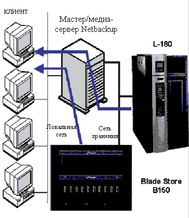 | Рисунок 1. Комбинация резервного копирования на базе диска и магнитной ленты: во время резервного копирования подлежащие сохранению данные передаются от клиента на Netbackup Media Server, где они записываются на жесткий диск. Затем образ для резервного копирования дублируется с диска на магнитную ленту. |