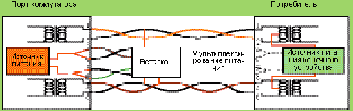 Принцип технологии мультиплексирования питания при включении источника между коммутатором и потребителем.