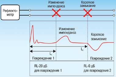 Чтобы не возникло путаницы, необходимо запомнить: малые значения обратных потерь говорят о том, что существенная часть энергии импульса отражается в точке дефекта кабеля (т. е. обратные потери малы). Чем больше значение обратных потерь, тем слабее дефект, и наоборот. От дефектов наподобие обрыва или короткого замыкания отражается вся энергия излучаемого импульса, поэтому обратные потери будут нулевыми.
