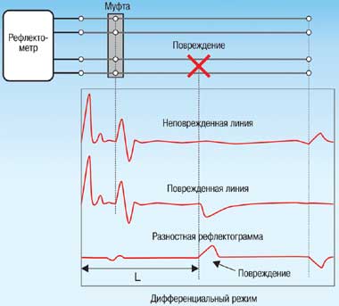 Дифференциальный режим более удобен — рефлектограммы поврежденной и исправной пар вычитаются, что приводит к компенсации почти всех синхронных помех. Таким способом гораздо проще выявить различия, чем при визуальном сравнении, и благодаря этому на разностной рефлектограмме хорошо заметны места повреждений.