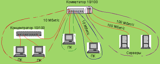 Такая распространенная некогда конфигурация локальной сети Ethernet сегодня встречается редко: скорости выросли на порядок, а подешевевшие коммутаторы практически вытеснили концентраторы.