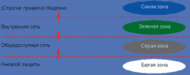 Сеть разделена на сегменты (зоны) с различными требованиями к безопасности (см. Рисунок 1), которые, в свою очередь, физически разделены между собой и могут быть разделены (по приложениям, например) и дальше (в частности, при помощи виртуальных сетей). Все сетевые объекты в широком смысле (приложения, системы, пользователи) приписываются к соответствующей зоне в зависимости от их владельца/ответственного. Для каждой зоны действуют свои директивы по инсталляции/конфигурации/эксплуатации систем (в отношении документации, управления пользователями, управления доступом, повышения надежности системы, регистрации, непрерывности бизнеса и т. д.). Коммуникационные взаимосвязи между зонами подчиняются четким правилам; так, они могут устанавливаться только между двумя соседними зонами, а определенные коммуникационные процессы должны обязательно шифроваться (см. Рисунок 2).
