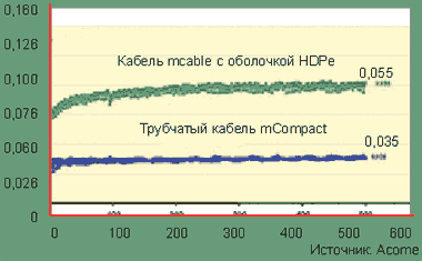 | Рисунок 2. Сравнение коэффициента трения микрокабелей с полиэтиленовой оболочкой (кабель mcable с оболочкой из высокоплотного полиэтилена) и со структурированной оболочкой (трубчатый кабель mCompact). |
