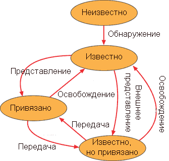 - Удаление открытого ключа (процесс: освобождение) переводит устройство обратно в самоуправляемое состояние (состояние: известно).