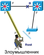 Обычно физической связи с двумя коммутаторами у него нет, поэтому описанный метод атаки вряд ли возможен. Однако ситуация меняется при использовании беспроводных сетей, поскольку кабельное подключение (розетка в офисе) и беспроводное подключение (точка доступа на [магистральном] коммутаторе) заканчиваются на разных коммутаторах (см. Рисунок 2).